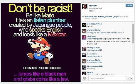 Балотелли в социальной сети опубликовал баннер с изображением персонажа компьютерных игр "Супер Марио", где также были написаны следующие слова: "…прыгает как черный человек, хватает монеты как еврей".