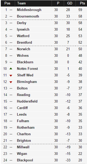 В любом высшем дивизионе не найти более важного события, чем встреча первой и второй команды в таблице. В Чемпионшипе это не самое важное, учитывая тот факт, что обе первые команды поднимаются в классе, а титул победителя дивизиона вместе с кубком больше выглядит приятной формальностью. По итогам 30-го тура как раз и четко видна суть всего, пока Борнмут и Дерби играли между собой Миддлсбро подстерег их неудачи и вырвался на вершину.