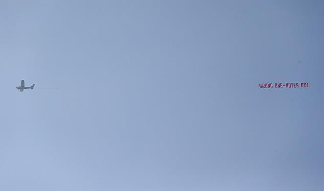 Стоит отметить, что в 2014 году к подобному трюку прибегнули болельщики Манчестер Юнайтед. На игре против Астон Виллы самолет пролетел с баннером "Неподходящий: Мойес, уходи".