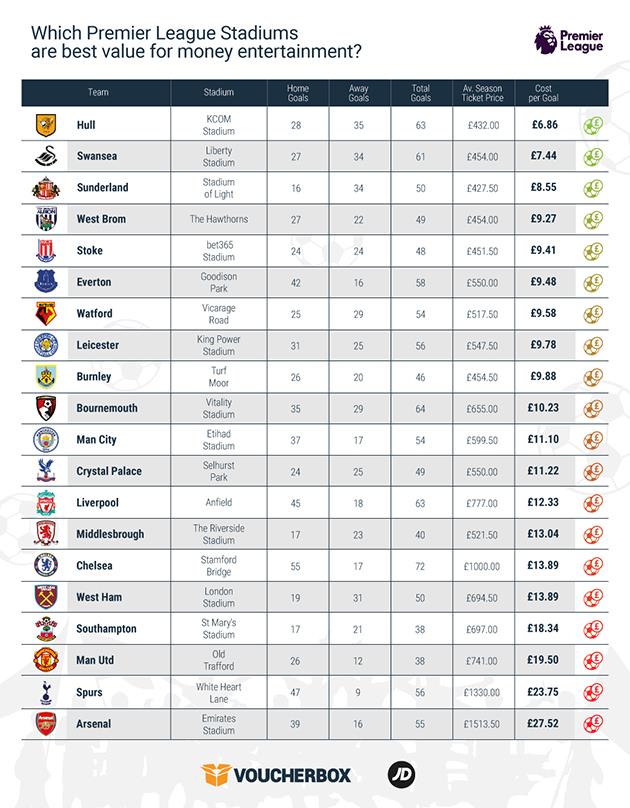 Больше всего голов зрители увидели на Стэмфорд Бридж (Челси, 72 гола по 10,23 фунта), Дин Корт (Борнмут, 64 по 10,23), Энфилд Роуд (Ливерпуль, 63 по 12,33) и вышеупомянутом Кей Си (Халл).