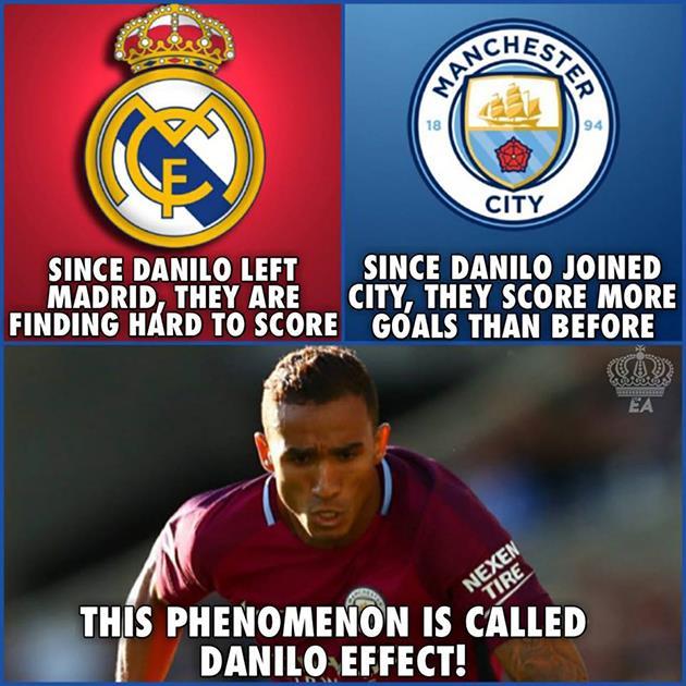 Данило перешел из Реала в Ман Сити. Реал стал забивать мало, Ман Сити — много. Этот феномен называет "Эффект Данило!"