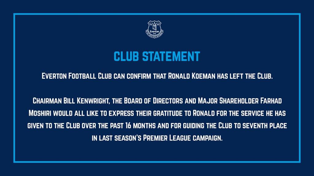 "ФК Эвертон подтверждает, что Рональд Куман покинул клуб. Руководство клуба хочет выразить свою признательность Рональду за его работу во благо клуба в последние 16 месяцев и за то, что привел его к 7-му месту в прошлом чемпионате.