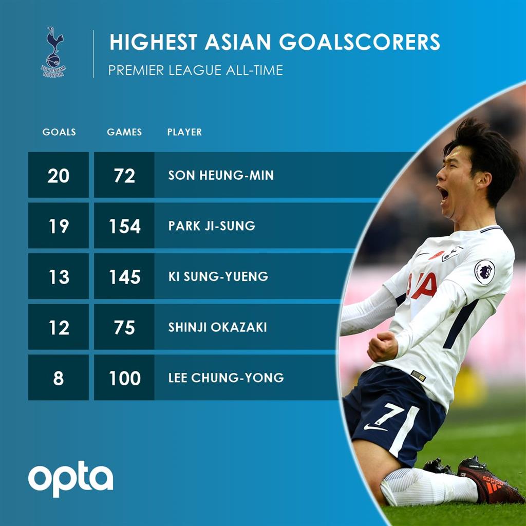 20 — Сон Хын Мин забил 20 голов в Премьер-лиге, и это лучший результат среди всех азиатов.