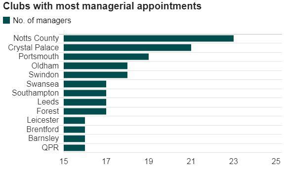 Лидером по количеству изменений на тренерском мостике за последние 20 лет стал Ноттс Каунти (23 тренера). Кристал Пэлас (21) и Портсмут (19) входят в тройку.