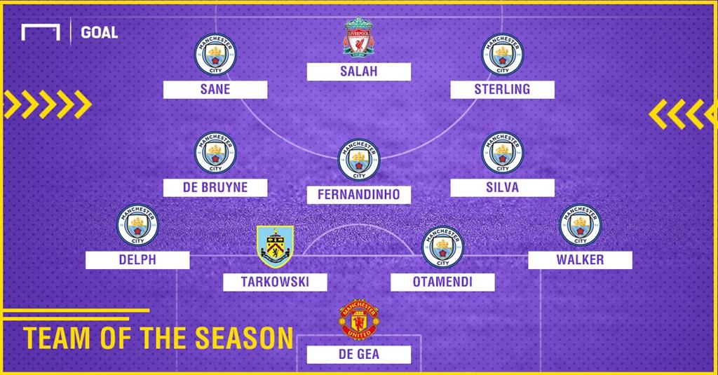 Давид Де Хеа (Ман Юнайтед) — Кайл Уокер (Ман Сити), Николас Отаменди (Ман Сити), Джеймс Тарковски (Бернли) — Фабиан Делф (Ман Сити) — Давид Силва (Ман Сити), Фернандиньо (Ман Сити), Кевин Де Брюйне (Ман Сити) — Рахим Стерлинг (Ман Сити), Мохамед Салах (Ливерпуль), Лерой Сане (Ман Сити)