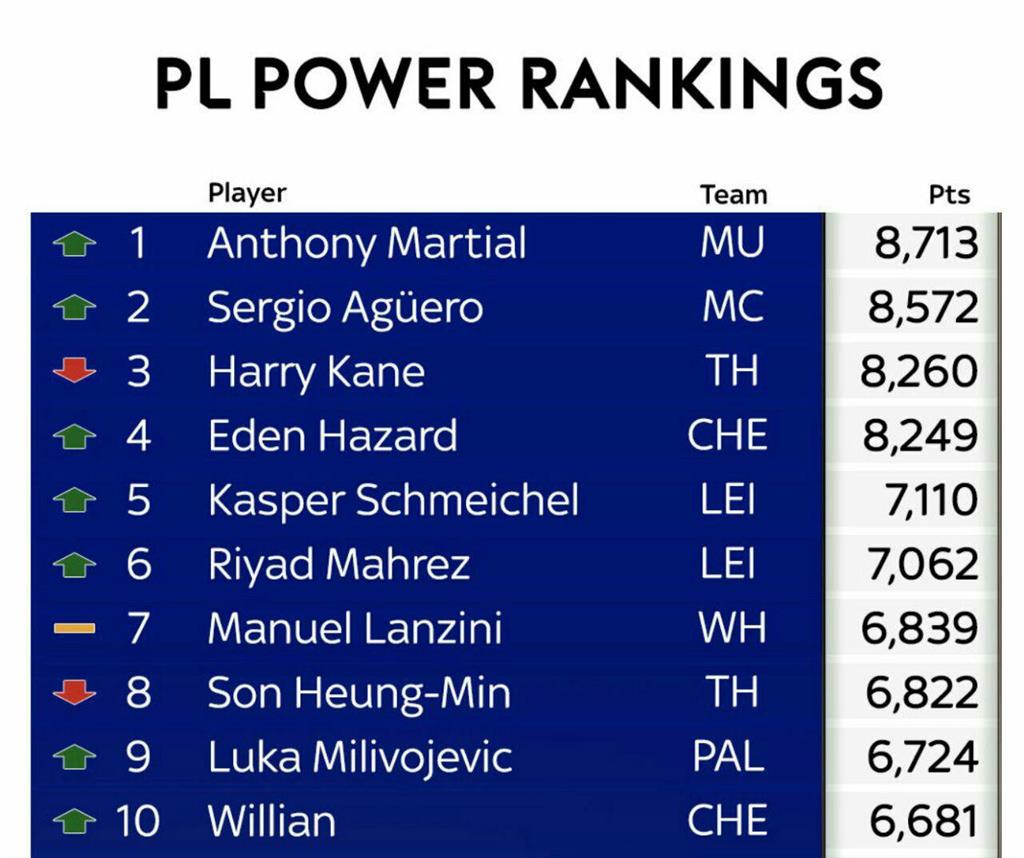 В сезонном рейтинге силы все еще лидирует Кевин Де Брюйне, который на более чем на 1 балл (58,9992) опережает Харри Кейна (57,940). В ТОП-5 также входят Салах, Стерлинг и Марез. Антони Мартиаль в сезонном рейтинге на 22-м месте.