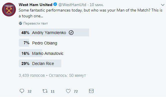 Не удивительно, что болельщики "молотобойцев" в голосовании на официальной странице Вест Хэма в Twitter считают лучшим Ярмоленко.