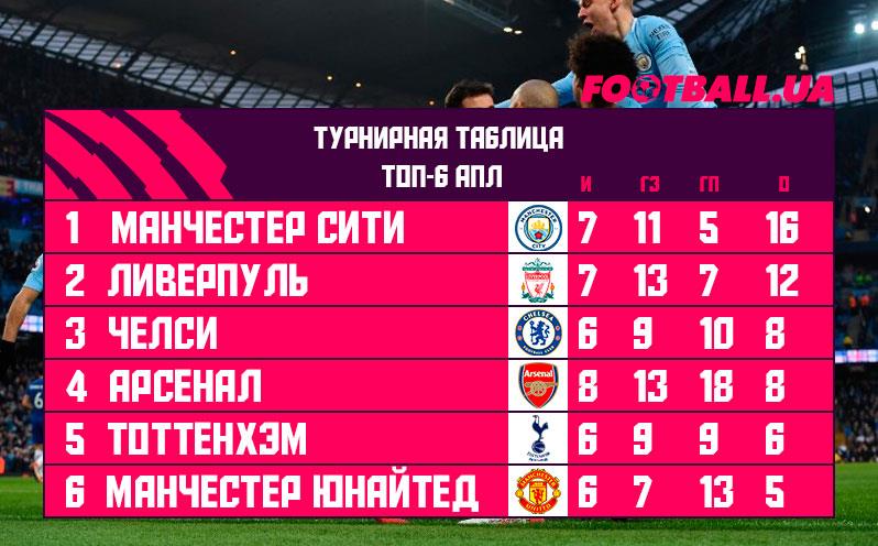 Сити провел уже семь из десяти матчей против соперников из ТОП-6 и набрал в них 16 очков (5 побед, 1 ничья, 1 поражение). Ливерпуль — второй, МЮ — последний.