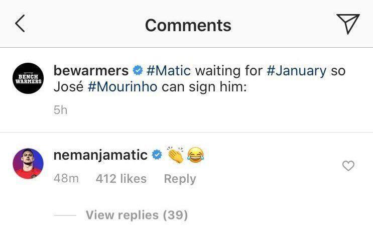 Полузащитник МЮ Неманья Матич, после назначения Моуриньо в Тоттенхэм, лайкнул и прокомментировал в Instagram пост о том, что в январе португалец в третий раз за карьеру предложит ему перейти в свою команду.