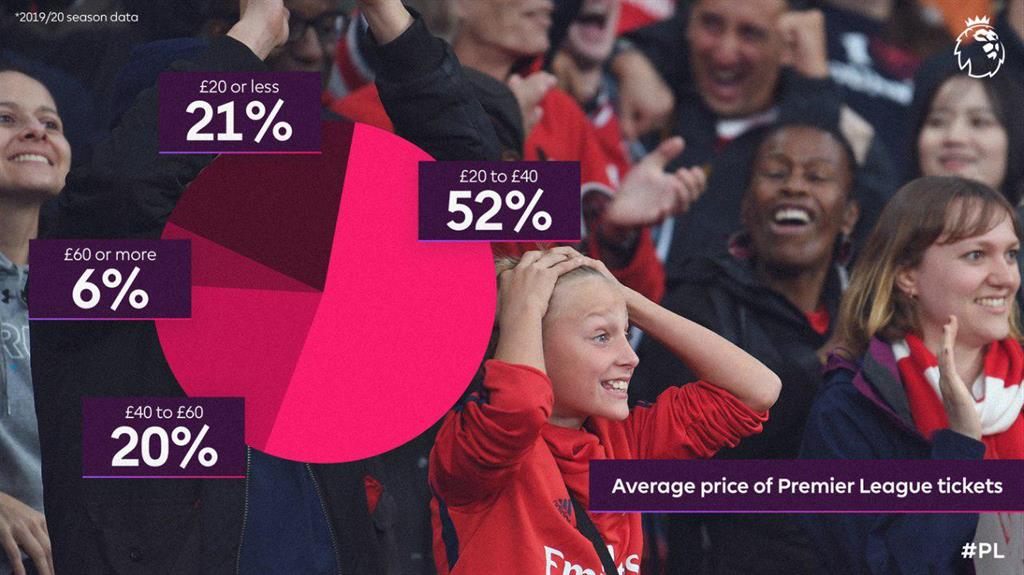 В этом сезоне АПЛ средняя стоимость билета на матч составляет 32 фунта. Для сравнения, в сезоне-2018/19 она составляла 31 фунт, а в сезоне-2017/18 – также 32 фунта. Однако большинство болельщиков платят за вход на стадион менее 30 фунтов. Более половины от общего количества билетов продаются дешевле их полной стоимости благодаря системе скидок и льгот. Обладатели сезонных абонементов в целом экономят 16 миллионов фунтов благодаря раннему бронированию, продлению и долгосрочным соглашениям.