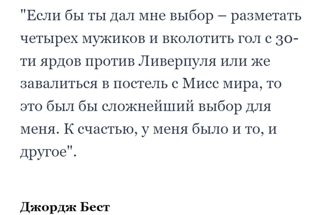 "Если бы я родился уродцем, поверьте, вы бы забыли о Пеле. Для вас существовал бы только Джордж Бест", — одно из многочисленных высказываний "Пятого Битла". Бест, как и некоторые другие легенды Манчестер Юнайтед, помимо выдающихся действий на футбольном поле, запомнился и своими поступкам вне его.