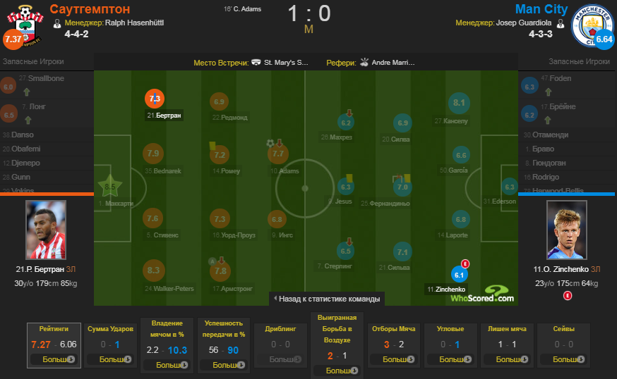 Справедливости ради, матч с Саутгемптоном стал для 23-летнего украинца далеко не самым лучшим в карьере. На 16-й минуте игры Зинченко получил передачу в центре поля, однако соперник отобрал у него мяч, после чего Че Адамс практически с центра поля перекинул вратаря.