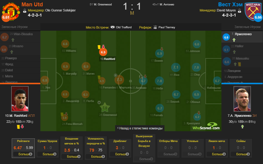 Справедливости ради, у Ярмоленко не было достаточно времени, чтобы повлиять на результат, поскольку отыграл он всего несколько минут. Вполне ожидаемо, что специализированный портал WhoScored поставил Андрею одну из низших оценок в этом матче — 5,99. Хуже бал оказался только игроков МЮ Тимоти Фосу-Менса (5,91) и Одиона Игало (5,97).