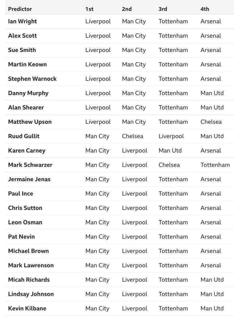 Как видим, мнения экспертов разделились: за исключением Руда Гуллита, который очень верил в Челси, все делали ставку на то, что первые два места разыграют между собой Ливерпуль и Манчестер Сити.