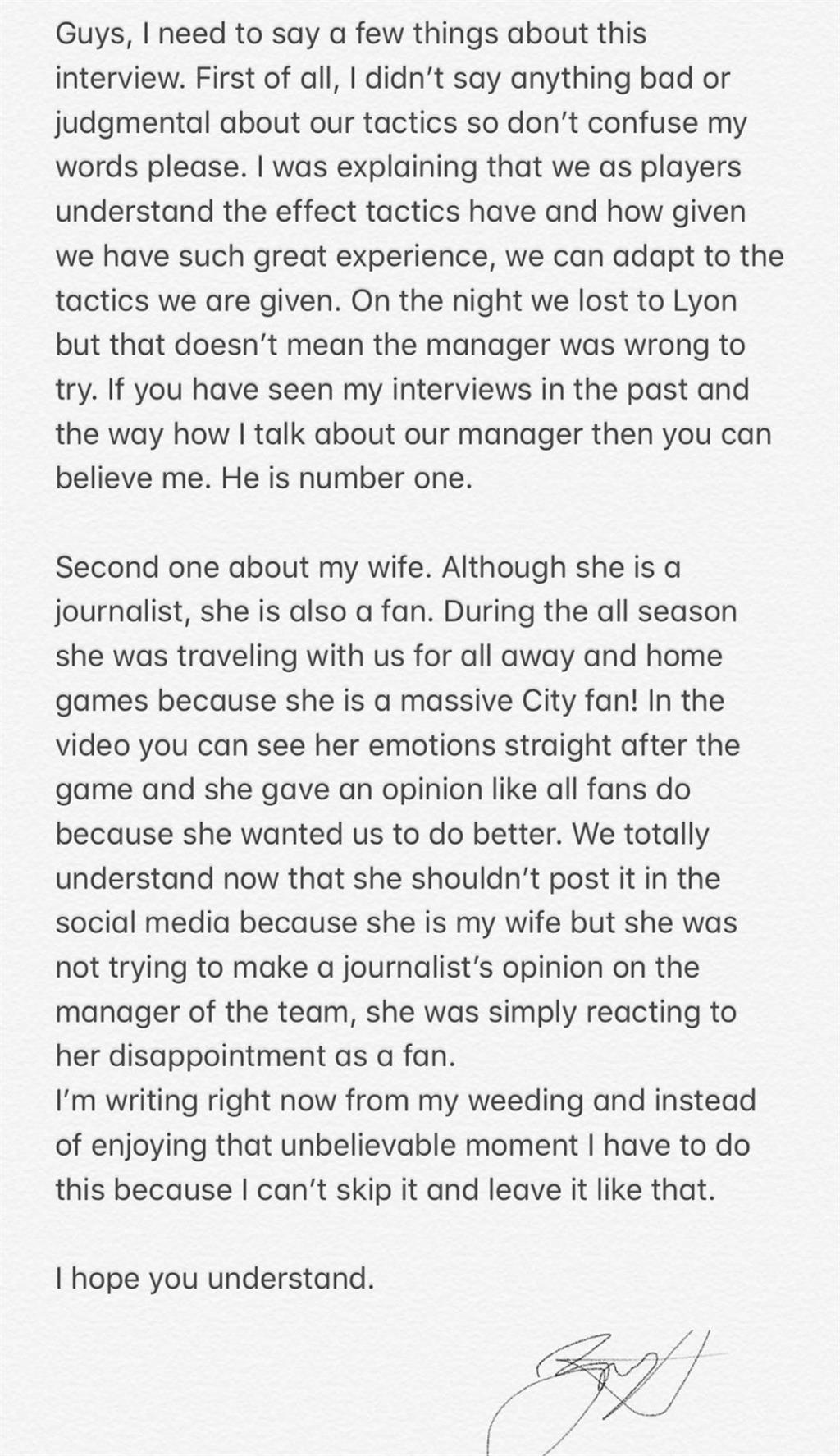 "Во-вторых, о моей жене. Хоть она и журналист, она также болельщица. На протяжении всего сезона она ездила с нами на выездные и домашние игры, потому что она огромная фанатка Ман Сити! На видео эмоции сразу после матча, она высказывает свое мнение, как и все болельщики, ведь она хотела, чтобы мы сыграли лучше".