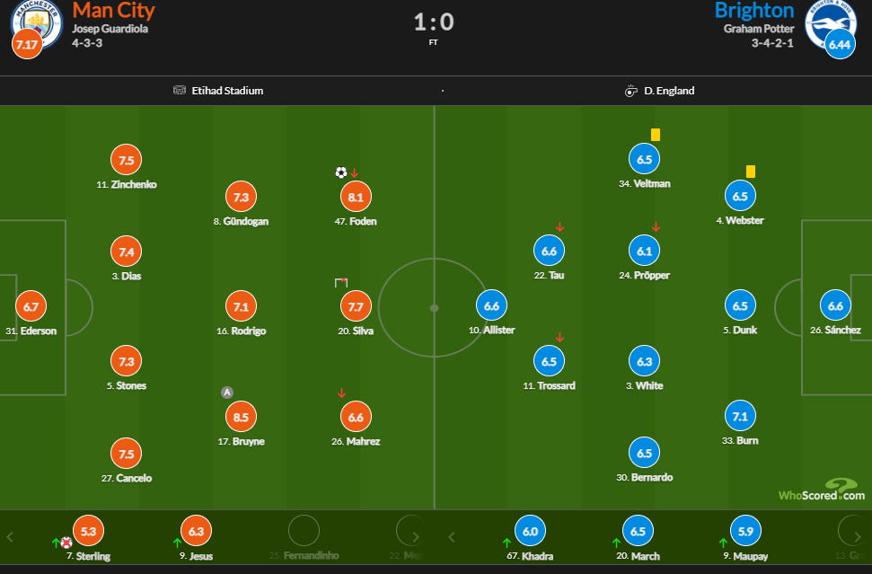 Лучшим футболистом игры стал Кевин Де Брюйне — 8,5, а автор гола Фил Фоден получил балл 8,1.
