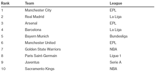 Первые шесть мест сводного рейтинга оказались за футбольными клубами, трое из которых представляют непосредственно английскую Премьер-лигу. Возглавил рейтинг Манчестер Сити, следом за которым расположился мадридский Реал.
