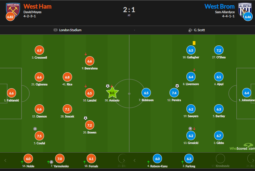 Вест Хэм на своем поле принимал Вест Бромвич Альбион в рамках поединка 18-го тура английской Премьер-лиги и добился победы со счетом 2:1.