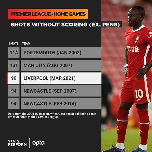 С момента начала ведения подобной статистики (сезон-2006/07), данный показатель является третьим в ранге негативных. "Опережают" команду Юргена Клоппа лишь Манчестер Сити (101 удар, до августа 2007 года) и Портсмут (114 ударов, до января 2008 года).
