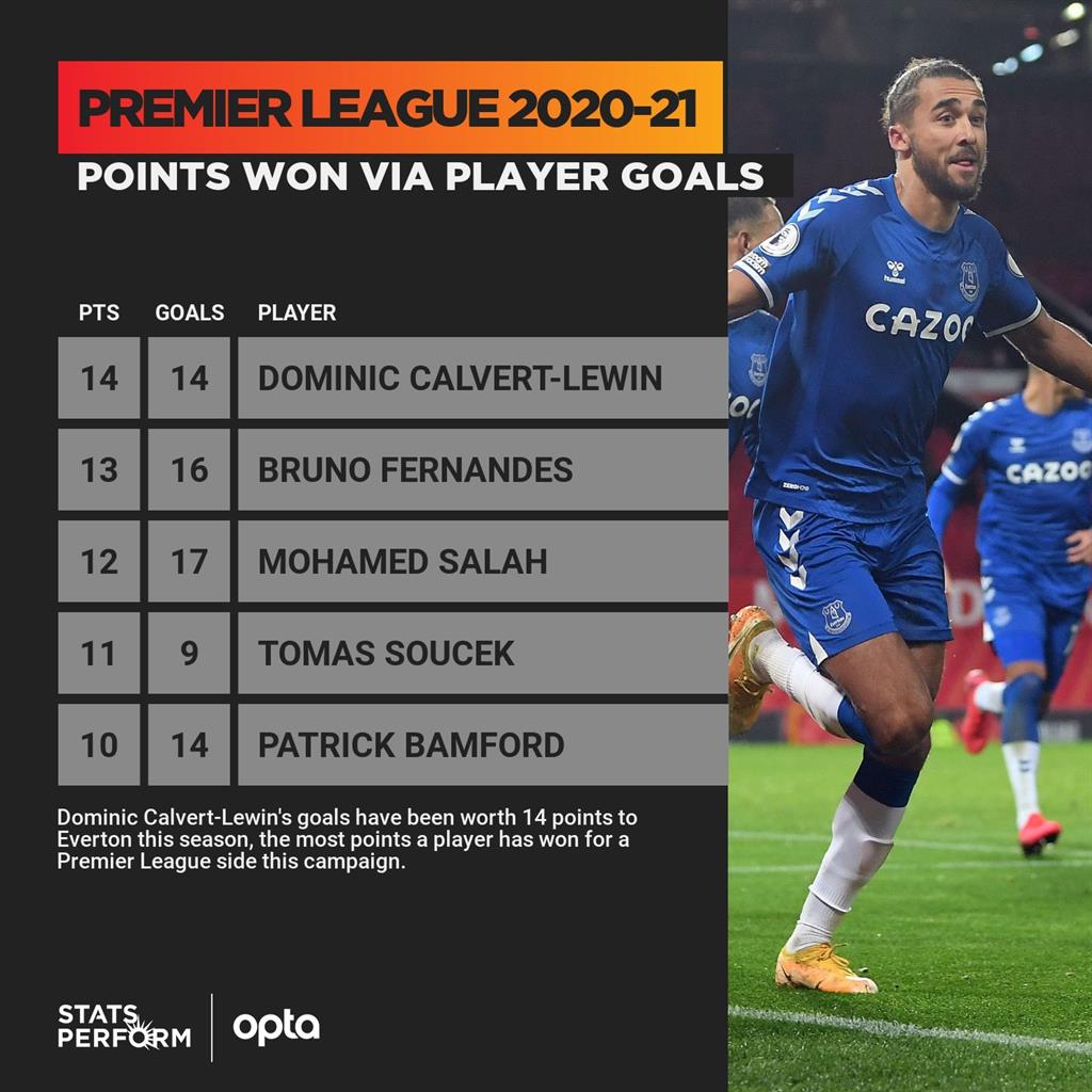 В данном аспекте Калверту-Льюину удалось опередить Бруну Фернандеша из Манчестер Юнайтед, Мохаммеда Салаха из Ливерпуля, Томаша Соучека из Вест Хэма и Патрика Бэмфорда из Лидса, которые и составили топ-5.