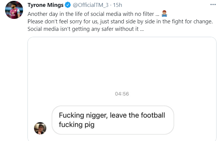 Защитник Астон Виллы Тайрон Мингс получил в Direct социальной сети Instagram расистские оскорбления.