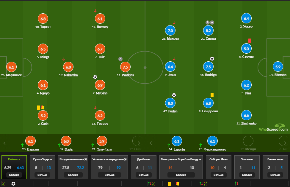 Что касается футболистов команды хозяев, то лучшим за игру стал хавбеки Джон Макгинн с оценкой 6,9.