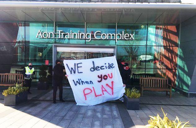 Стоит отметить, что до входа на тренировочную базу, группа фанатов позировала для снимков в хода в административный корпус, держа в руках баннеры с надписями: "Глейзеры — на выход", "Мы решаем, когда вам играть", "51% MUFC" (отсылка к предложенному премьер-министром Великобритании Борисом Джонсоном формате владения клуба, при котором ключевой пакет акций будет находится в руках членов клуба со стороны фанатов, на подобии с немецким вариантом).