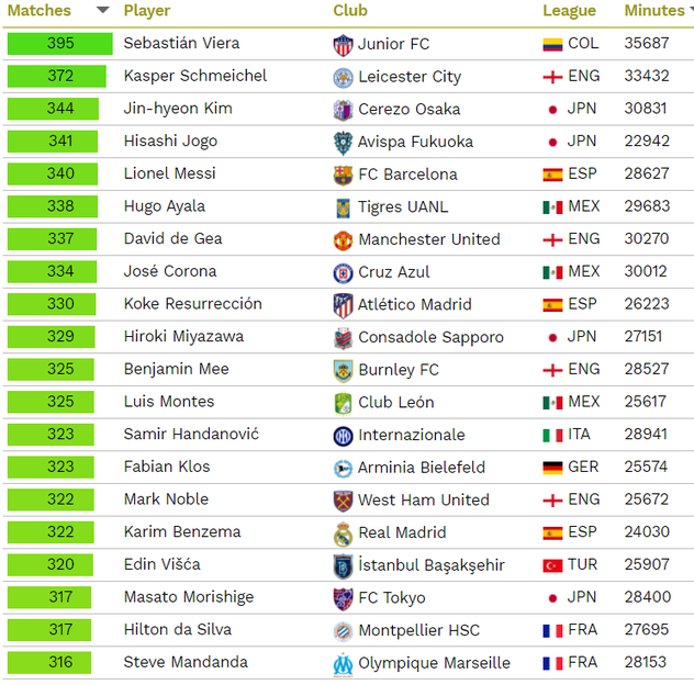 Примечательно, что после звезды "блаугранас" в рейтинге идет еще один голкипер из английской Премьер-лиги — Давид де Хеа из Манчестер Юнайтед провел за выделенный период времени 337 матчей.
