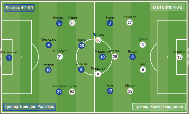 Лестер: Шмейхель, Рикарду Перейра, Сеюнджю, Амарти, Бертран (Томас, 78), Тилеманс (Сумаре, 72), Ндиди, Барнс (Ихеаначо, 79), Мэддисон (Дьюзбери-Холл, 71), Перес (Олбрайтон, 71), Варди (Дака, 71).