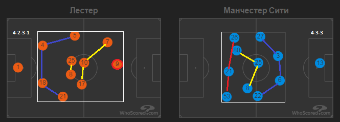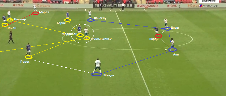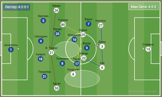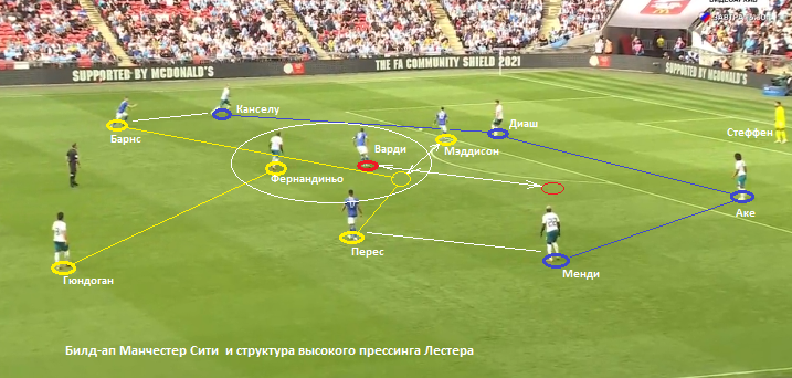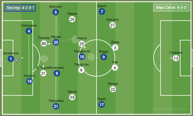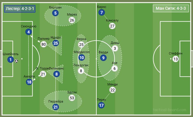 Перес и Барнс с зазором контролировали Менди и Канселу соответственно, а Мэддисон и Варди поочередно закрывали Фернандиньо и атаковали владеющего мячом центрбека Сити. При этом пара опорников Лестера держала в центре "восьмерок" Манчестера, а фулбеки отвечали за вингеров.