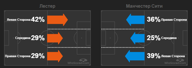 Лестер при построении атак явно заваливалась на свой левый фланг. Через эту вертикальную зону прошло 42% активных действий команды. Манчестер Сити в этом плане был более сбалансированным и разнообразным. Касательно горизонтальных зон, у чемпионов было солидное статистическое преимущество, которое, правда, не имеет ничего общего с эффективностью.