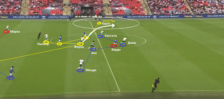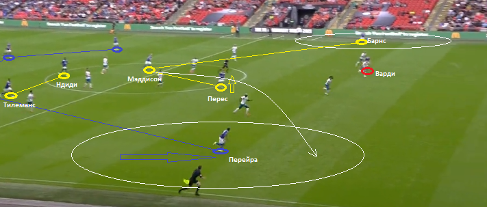 Нужно отметить, что за счет своевременных смещений игроков Лестер умело создавал себе пространство на флангах. В данном случае Перес заставил линию обороны Сити сузиться и правый фулбек Перейра параллельно с левым вингером Барнсом решительно атакуют глубину.