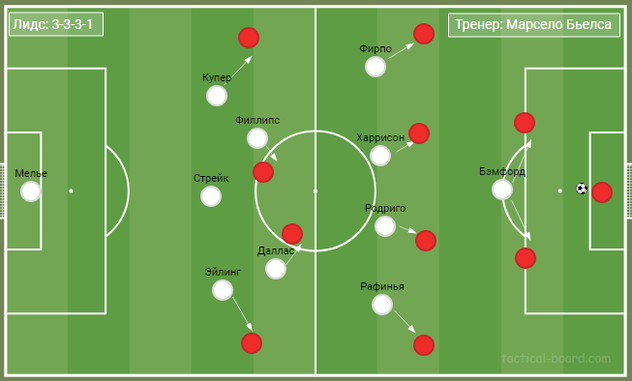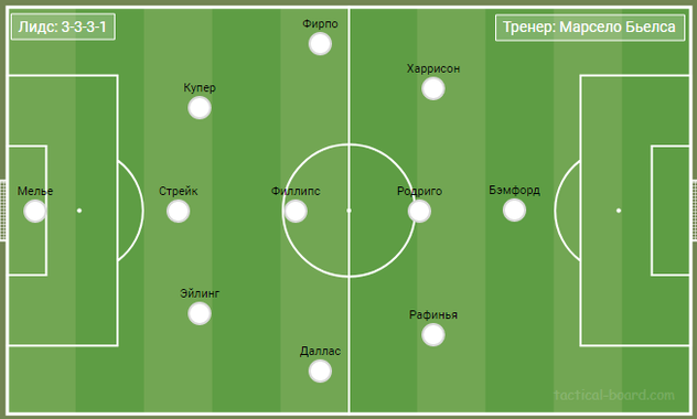 Тем не менее, периодически аргентинец возвращается к структуре с тремя тройками в линиях обороны, полузащиты и атаки. В частности, Лидс играл подобным образом в концовке прошлого чемпионата, и на старте нынешнего в двух из шести матчах команда снова действовала по схеме 3-3-3-1 (результативные ничьи с Эвертоном и Бернли). Разберем принципы взаимодействий игроков Лидса в этой весьма необычной структуре.