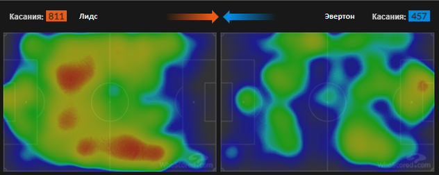 По большому счету, весь контроль мяча Лидса заключается в коротком розыгрыше на своей половине поля. Как только удается растянуть структуру оппонентов по вертикали или заставить соперника поднять линию обороны, следует заброс или длинная передача в заранее перегруженную зону. Именно этот сценарий старательно вырисовывал нам тепловую карту в матче с Эвертоном.