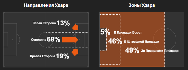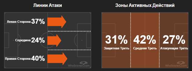 Тепловая карта из этого же матча демонстрирует наиболее важные зоны для продвижения мяча.
