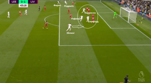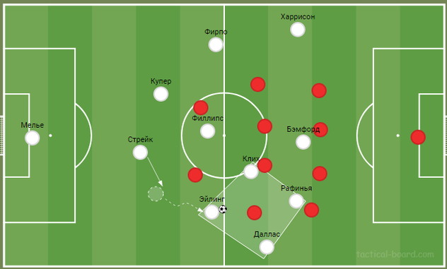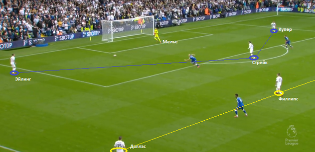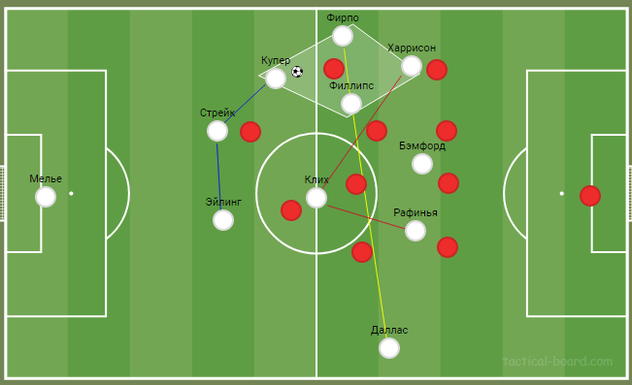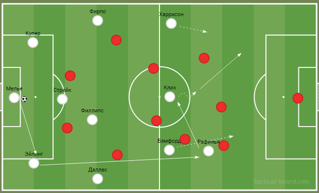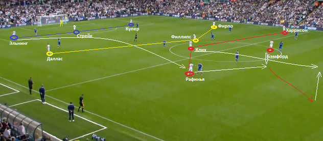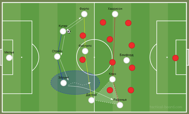 На скриншоте выше — похожий момент, который привел к голу в том же матче. Эйлинг исполнил длинную передачу на Рафинью, который бросил в прорыв Бэмфорда. Форвард понимал, что вряд ли уйдет в данной ситуации от защитника (мяч шел от ворот) и протянул мяч в правое полупространство, сознательно освободив зону в центре для Клиха, который в динамике завершал эпизод.
