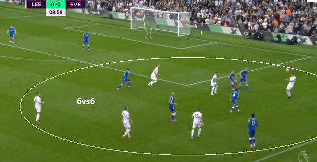 Перегрузы определенных вертикальных зон позволяют создавать изоляцию в дальнем от зоны мяча коридоре. В разных матчах можно наблюдать, как команда Бьелсы переводит мяч на дальний фланг и быстро старается создать ситуацию 2 в 1. Если Лидс играет в 3 центрбека, то к изолированному вингеру уже в момент перевода присоединяется крайний центральный защитник. Если "павлины" играют по схеме 4-1-4-1, часто большинство помогает создать фулбек.