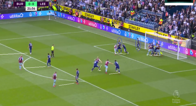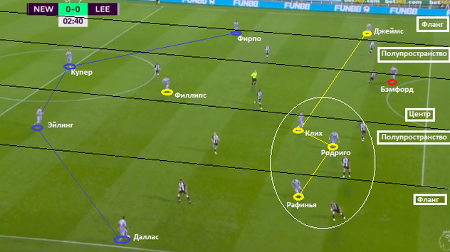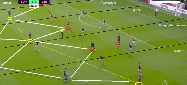 В этой фазе позиционной атаки Лидс также старается создавать и поддерживать диагональные векторы для передач в зонах мяча и взаимодействий. На скриншоте выше красным цветом обозначены игроки группы атаки, желтым — полузащитники, синим — защитники. Белыми линиями отмечены диагональные векторы.