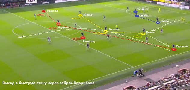 Отметим, что Рафинья — левша, он выполняет функции инвертированного вингера, ищет возможности смещения с мячом к центру под удар внутренней стороной стопы. В подобном ключе слева действует Джеймс, но Харрисон играет в другом стиле. Джек левша и его главные козыри — кроссы.