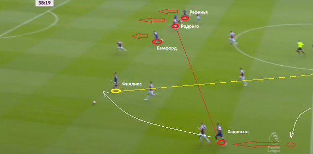 Асимметрия в линии атаки способствует созданию фазового пространства, в финальной трети поля. На схеме выше один из многочисленных примеров трансформации позиционной атаки Лидса в быструю атаку. Это комбинация из матча с Эвертоном. Бэмфорд уводит за собой одного из защитников, передача следует на Рафинью, который играет в центр на Клиха. Действия форварда и правого вингера создали условия для того, чтобы в линии обороны оппонента оказалось три защитника. Сосредоточенность на правом фланге еще и увеличила расстояние между защитниками. Быстрое взаимодействие привело к выводу на ворота Харрисона.