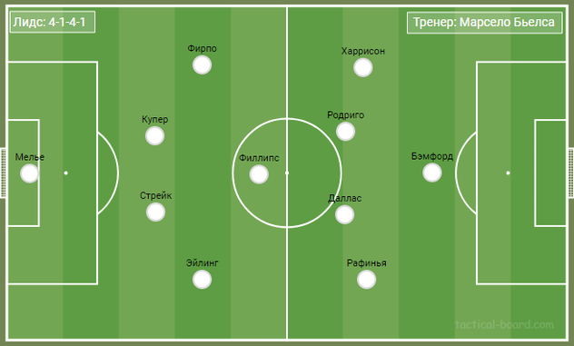 Даже играя по схеме 4-1-4-1 Лидс часто оставляет в линии обороны троих игроков. Один фулбек поднимается вверх, а тройку с защитниками составляет один из хавбеков.