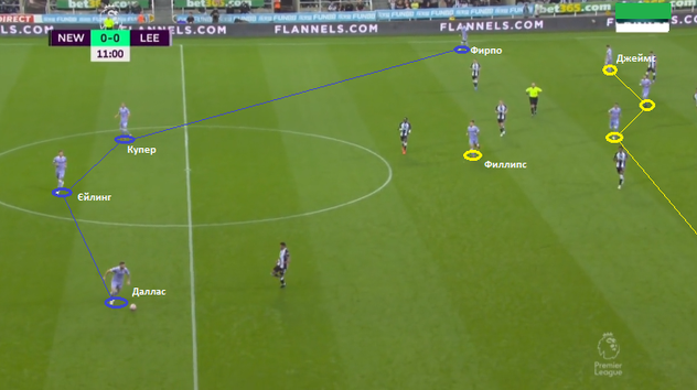 Во второй тройке действуют игроки, отвечающие за фланги и опорник. Слева играет Хуниор Фирпо, заменивший уехавшего на заработки в Саудовскую Аравию Алиоски. Справа мы поставили Далласа. Пожалуй, это основная позиция универсала. В центре поля действует ключевой футболист команды — Калвин Филлипс. Основной опорник сборной Англии способен автогеном выжигать свою зону деятельности и является важным связующим звеном между защитниками и группой атаки. Также Филлипс важен при быстрых переводах мяча с фланга на фланг.