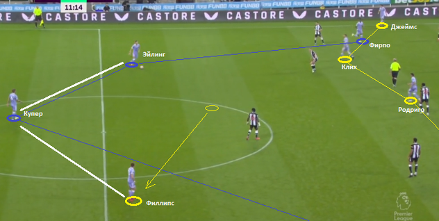 Важный момент в структуре — плавающая позиция Филлипса. Он не находится на одной оси с Мелье и Стрейком, а постоянно поддерживает диагональные векторы для потенциальных передач на него со стороны Стрейка и Эйлинга или Стрейка и Купера, в зависимости от того, в какой вертикальной зоне поля находится мяч.