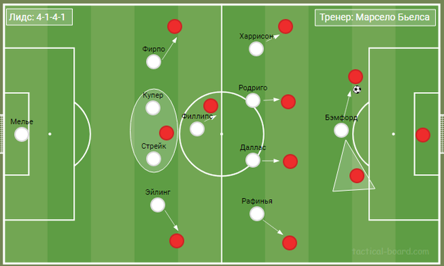 В большинстве случаев три игрока Лидса смещаются в полупространство. Если Бэмфорд уходит в глубину, Рафинья поднимается выше. Цель регулярных взаимозаменяемых смещений заключается в том, чтобы выдергивать обороняющихся игроков из их номинальных позиций. Игроки Лидса пытаются расшатывать оборонительную структуру оппонентов.