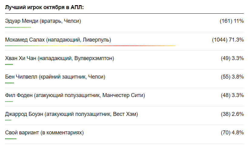 Среди кандидатов на звание лучшего игрока октября в АПЛ претендовали вратарь Эдуар Менди (Челси), нападающий Мохамед Салах (Ливерпуль), форвард Хван Хи Чан (Вулверхэмптон), крайний защитник Бен Чилвелл (Челси), атакующий полузащитник Фил Фоден (Манчестер Сити) и вингер Джаррод Боуэн (Вест Хэм). О достижениях каждого из них в прошлом месяце мы писали ранее.