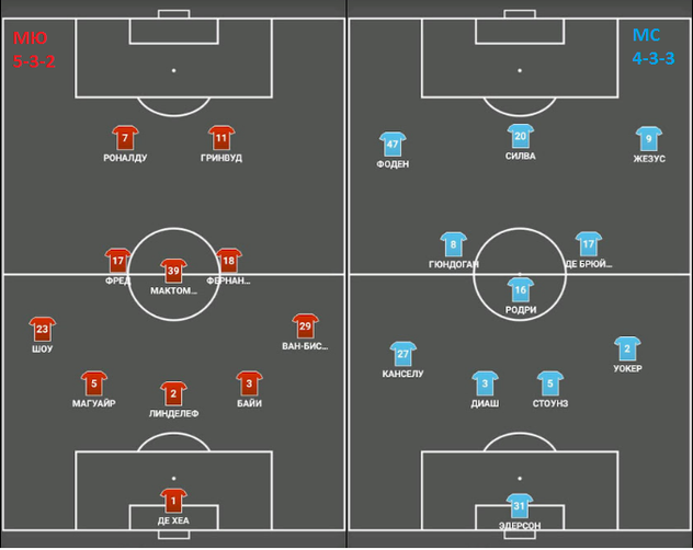 Манчестер Сити: Эдерсон, Уокер, Стоунз, Диаш, Канселу, Гюндоган, Родри, Силва, Жезус, де Брюйне, Фоден