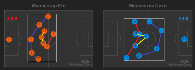 На мой взгляд, Солскьяер ошибся с выбором схемы 5-3-2. Позиционная текучесть Манчестер Сити, в которой, как минимум шесть игроков (Канселу и вся группа атаки) систематически менялись позициями, привела к тому, что на флангах и в полупространствах Сити регулярно имел свободного игрока.