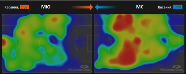 Большую часть игрового времени, команда Солскьяера просто беспомощно наблюдала за тем, как соперник играл в футбол. Порой создавалось впечатление, что это не манкунианское дерби, а тактическое упражнение Ман Сити, что-то вроде большого рондо, в котором группа игроков в красных футболах должна была постоянно находиться в деструктивной фазе игры.