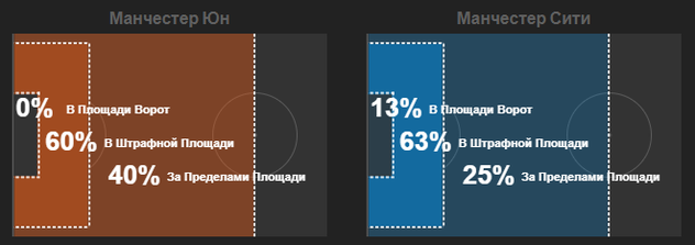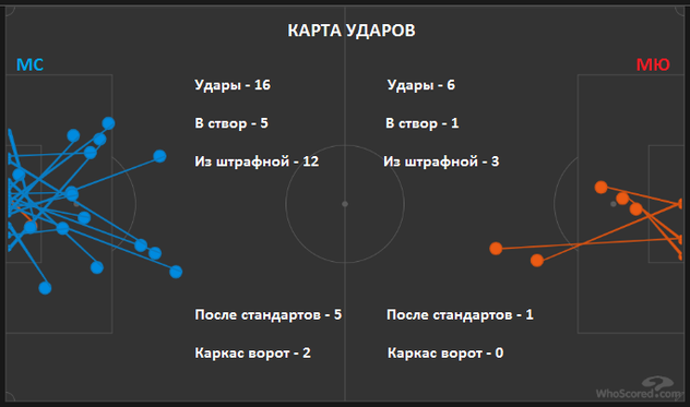 МЮ наиграл всего на три удара из пределов штрафной, из которых лишь один пришелся в створ ворот. Автором этого достижения был Криштиану Роналду. Один Де Брюйне из пределов штрафной нанес столько же ударов, сколько весь МЮ — 3. При подавляющем преимуществе в количестве ударов по воротам, Сити еще и 75% своих ударов наносил из штрафной.