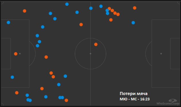 Обратите внимание на карту потерь мяча. Синим цветом отмечены потери Манчестер Сити, оранжевым, соответственно — МЮ. Разница в цифрах не выглядит слишком большой. К тому же МЮ в этом плане совершил меньше ошибок. Суть в зонах. Команда Гвардиолы практически не теряла мяч на своей трети поля, да и вообще, на своей половине поля имеет лишь четыре потери. У МЮ целых семь потерь на своей трети поля. Это результат эффективности высокого прессинга и контрпрессинга Ман Сити.